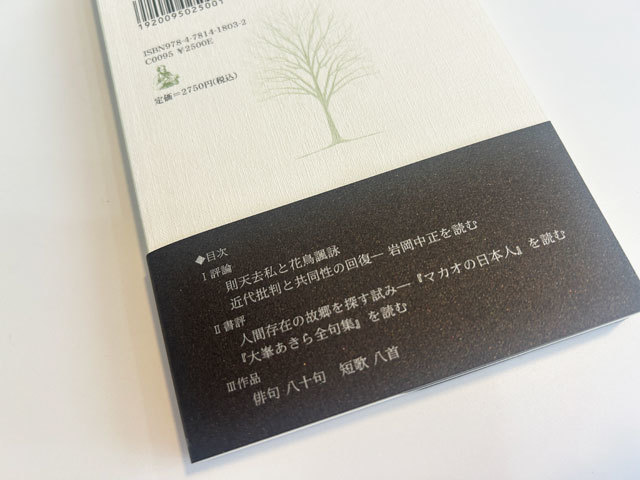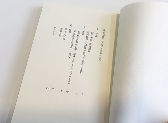本書は、三部構成となっている。Ⅰは評論(則天去私と花鳥諷詠、近代批判と共同性の回復─ 岩岡中正を読む)Ⅱは書評(人間存在の故郷を探す試み─『マカオの日本人』を読む、『大峯あきら全句集』を読む)Ⅲ(俳句 八十句 短歌 八首)。